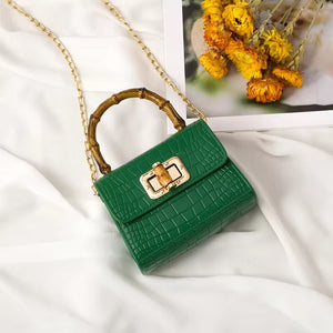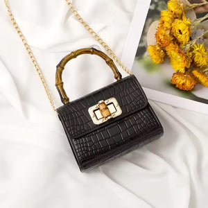Turn heads with this statement-making mini bag, featuring a luxe bamboo-inspired handle and a chic crocodile-textured finish. Compact yet classy, it’s designed to carry your essentials in style—perfect for brunch dates, evening outings, or adding a pop of color to your everyday look. With its gold-tone chain strap and timeless silhouette, the Bamboo Mini Bag is your go-to blend of elegance and trend.
