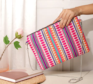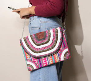 Where tradition meets trend. This boho-chic sling bag features intricate hand embroidery paired with a sleek metal chain strap. Lightweight yet eye-catching, it's perfect for adding a touch of artisanal charm to any outfit.