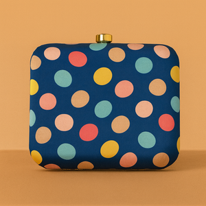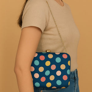 Add a pop of fun and elegance to your look with this vibrant clutch! Designed in a deep navy base and adorned with multicolored pastel polka dots, it brings together playful vibes and chic style. The golden clasp and sleek metal frame add a touch of sophistication, while the detachable golden sling chain lets you style it as a crossbody or carry it gracefully as a clutch.