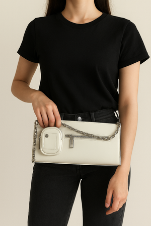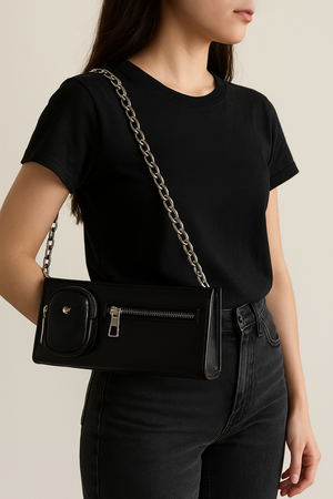 Our Pocket Drama Baguette Bag is the ultimate blend of elegance and edge. Crafted in premium faux leather with a luxe silver chain strap, and sling belt, it features a unique front mini-pouch and zipper detail for both style and function. Perfectly sized to carry your daily must-haves while keeping your look effortlessly chic — from day coffee runs to night-outs.