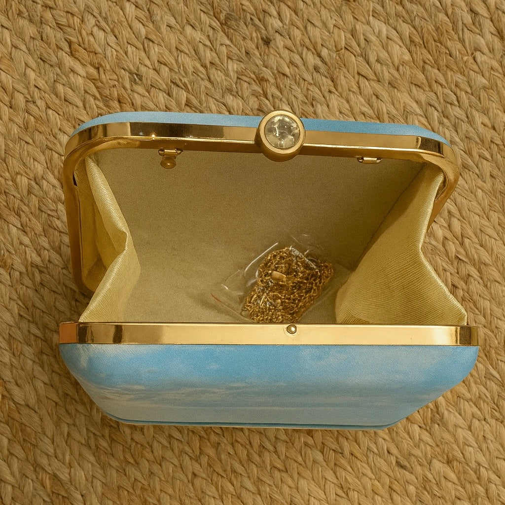 Bring the holiday spirit wherever you go with this vibrant clutch, inspired by sun-kissed beaches and endless horizons. Featuring a serene ocean backdrop with colorful beach chairs, it’s the perfect blend of playful charm and chic style. Crafted with a luxe finish, golden frame, and sparkling clasp, this clutch adds a breezy yet elegant touch to your festive looks, brunch dates, or vacation nights. Compact yet spacious enough for your essentials, it’s your go-to accessory for making every outing feel like a getaway.