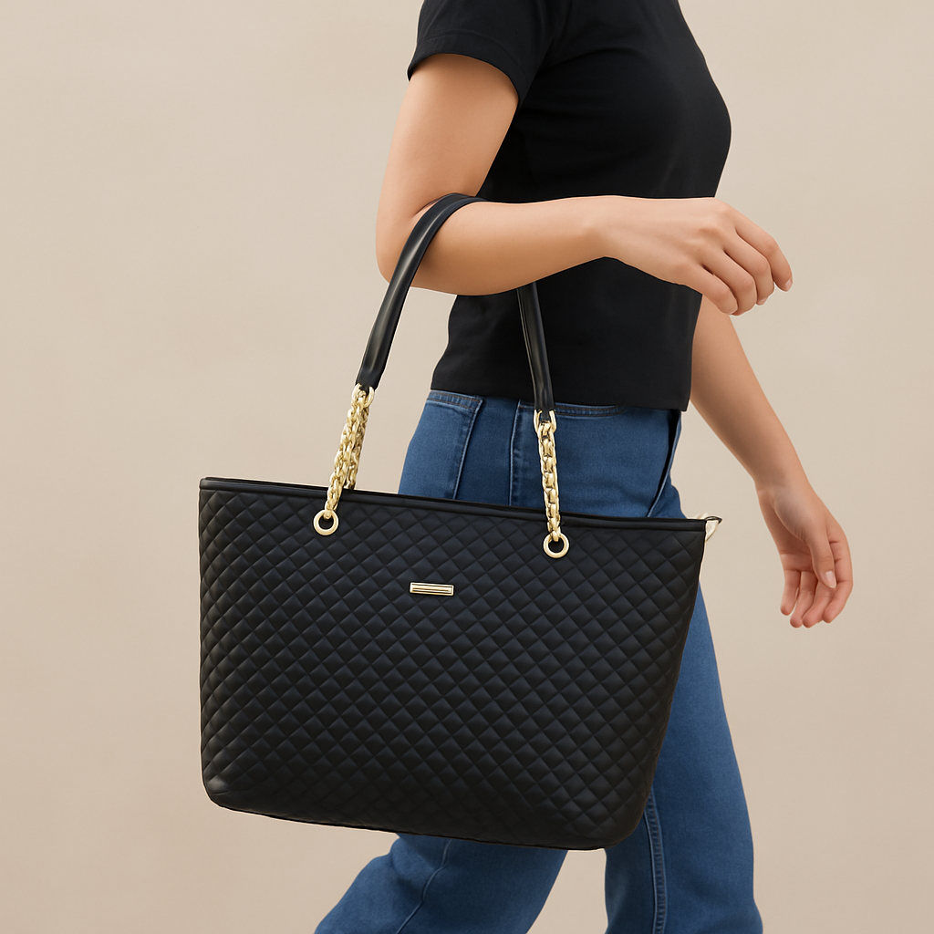 The Zyra Tote is where modern minimalism meets timeless luxury. With its quilted finish, golden chain details, and versatile design, it’s the statement piece that carries you from workday polish to weekend chic—effortlessly.